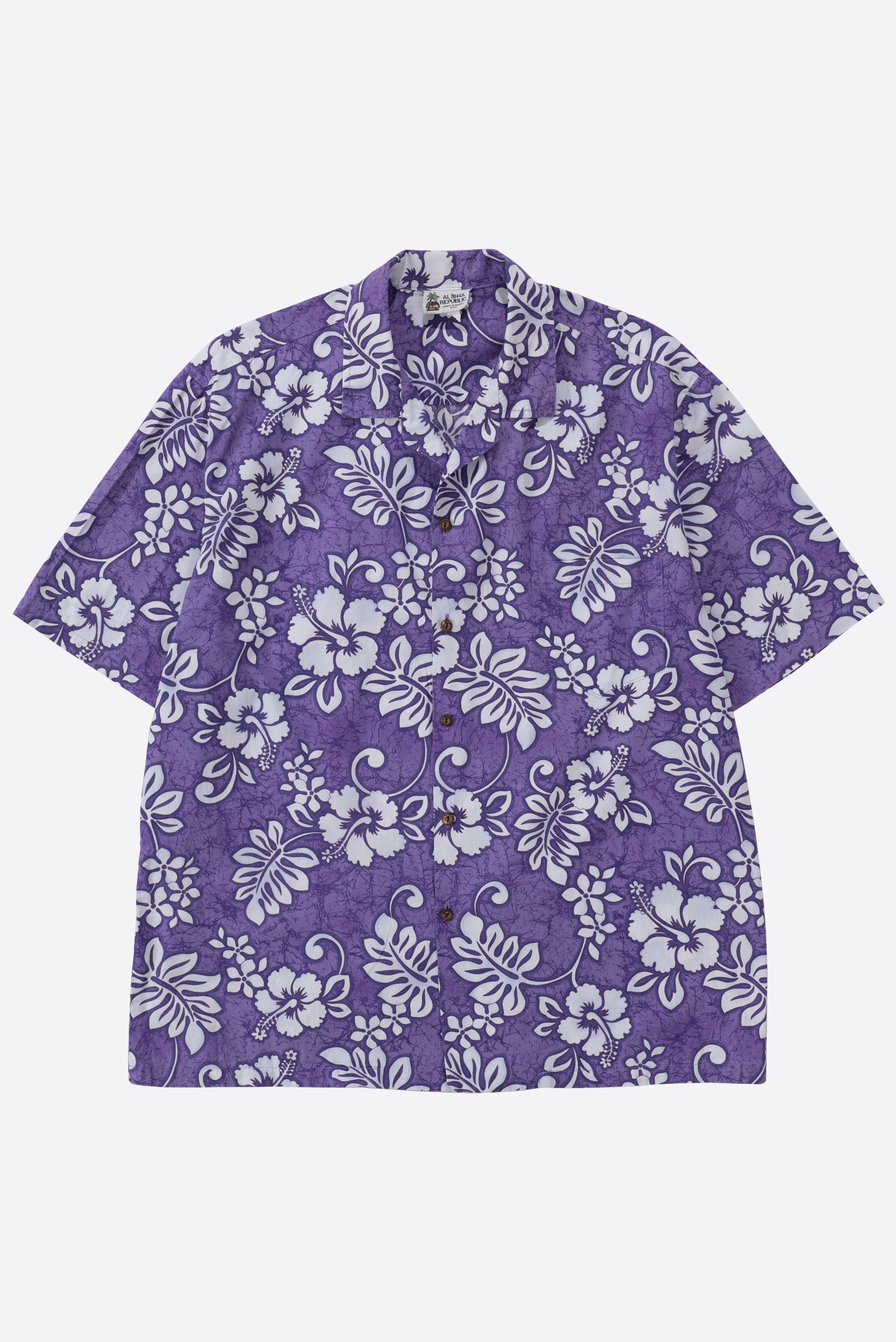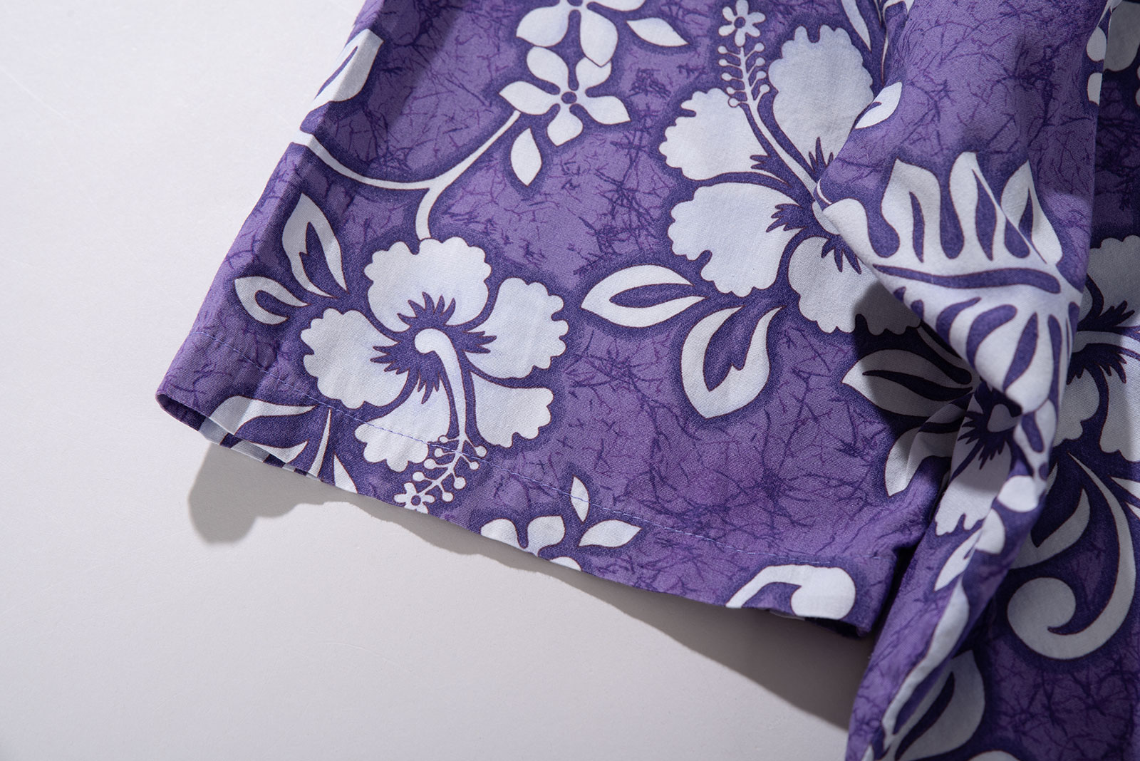 100% 코튼 원단으로 큼직하게 배치된 흰색 플로럴 패턴으로 하여금 1940~50년대 미국 본토에서 유행한 하와이안 셔츠 스타일을 연상시킵니다. 이런 대담하고 반복적인 플로럴은 당시 미국이 하와이를 ‘낙원의 상징’으로 소비하던 방식과도 맞닿아 있어요. 특히 보라색 배경은 흔치 않은 선택인데, 이는 하와이 왕정 시대의 전통색 중 하나로, 현지 문화에서는 권위와 고요한 품위를 의미하기도 합니다.