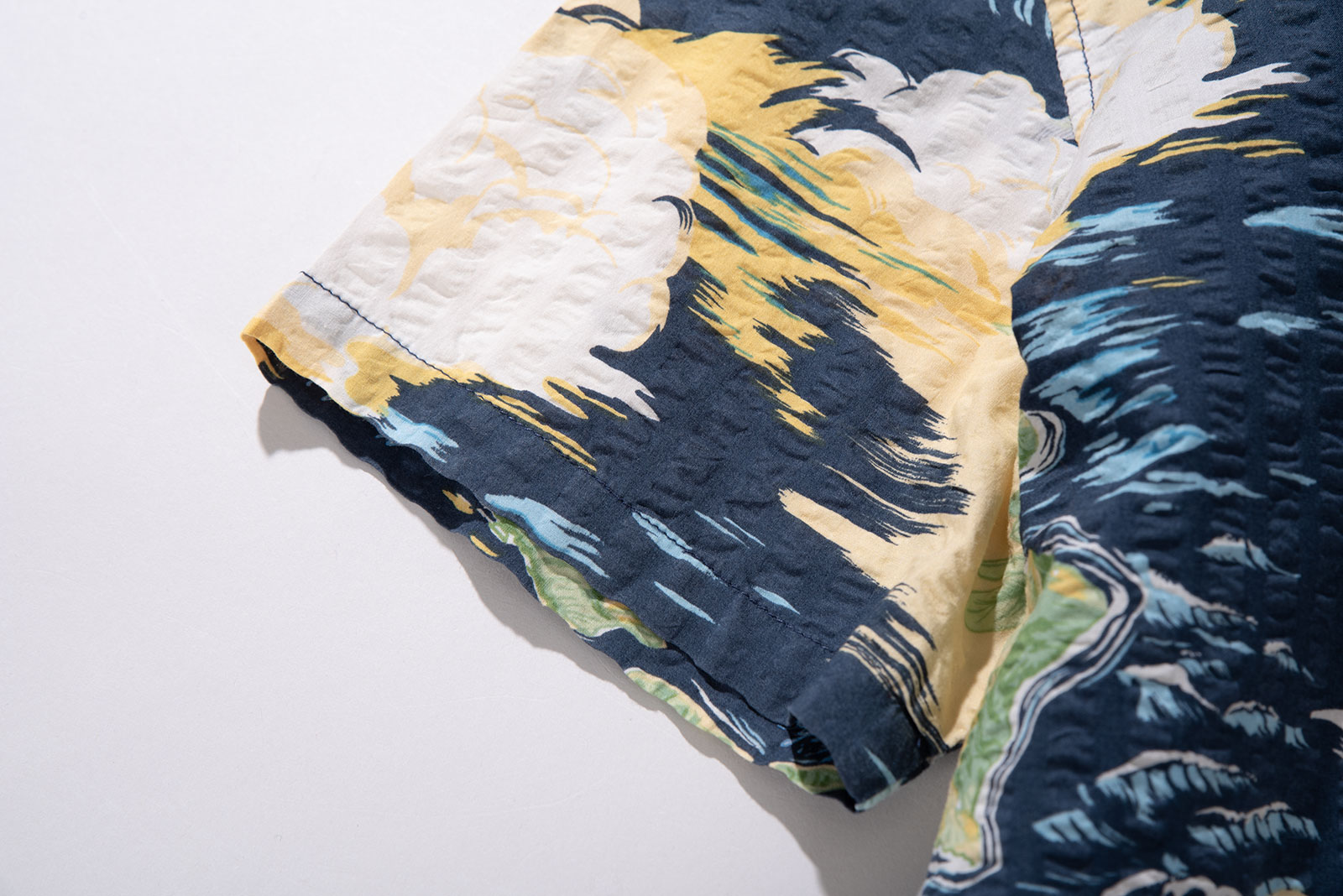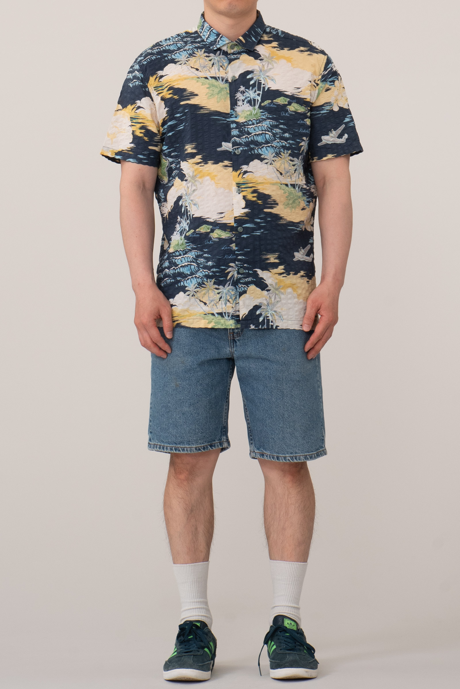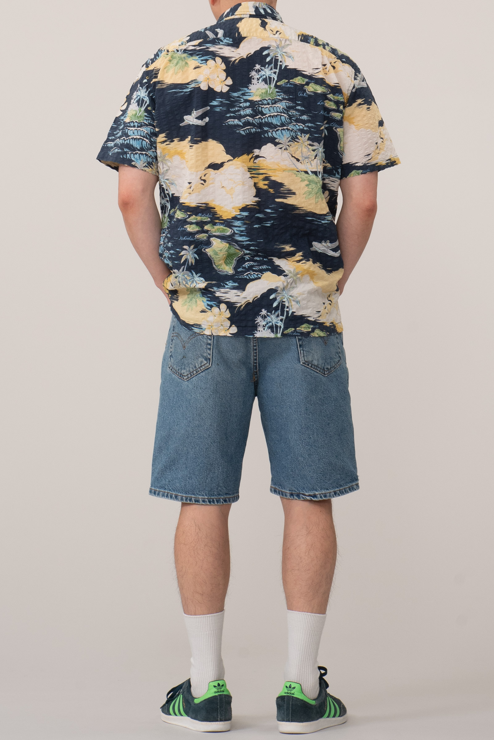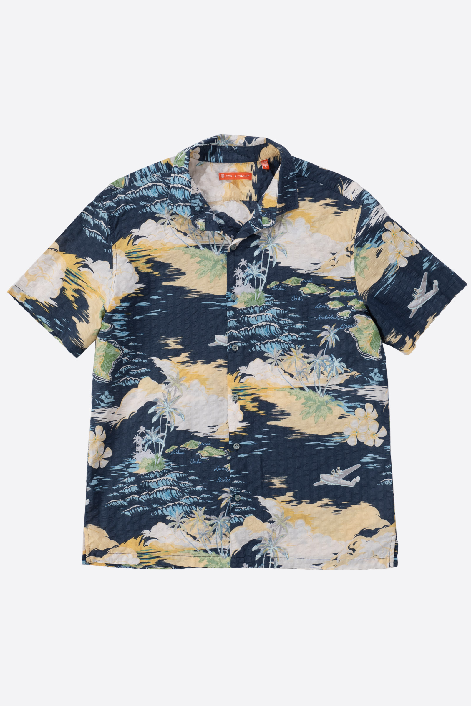 미국 하와이 브랜드 3대장 중 하나인 토리 리처드(Tori Richard)에서 제작된 시어서커 하와이안 셔츠입니다. 하와이 제도 각 섬의 이름이 지도 형식으로 프린트된 디자인이입니다. 표면에 고르게 요철감 있는 시어서커(Seersucker) 조직이 적용되어 있어 시원은 따 놓은 당상이죠.