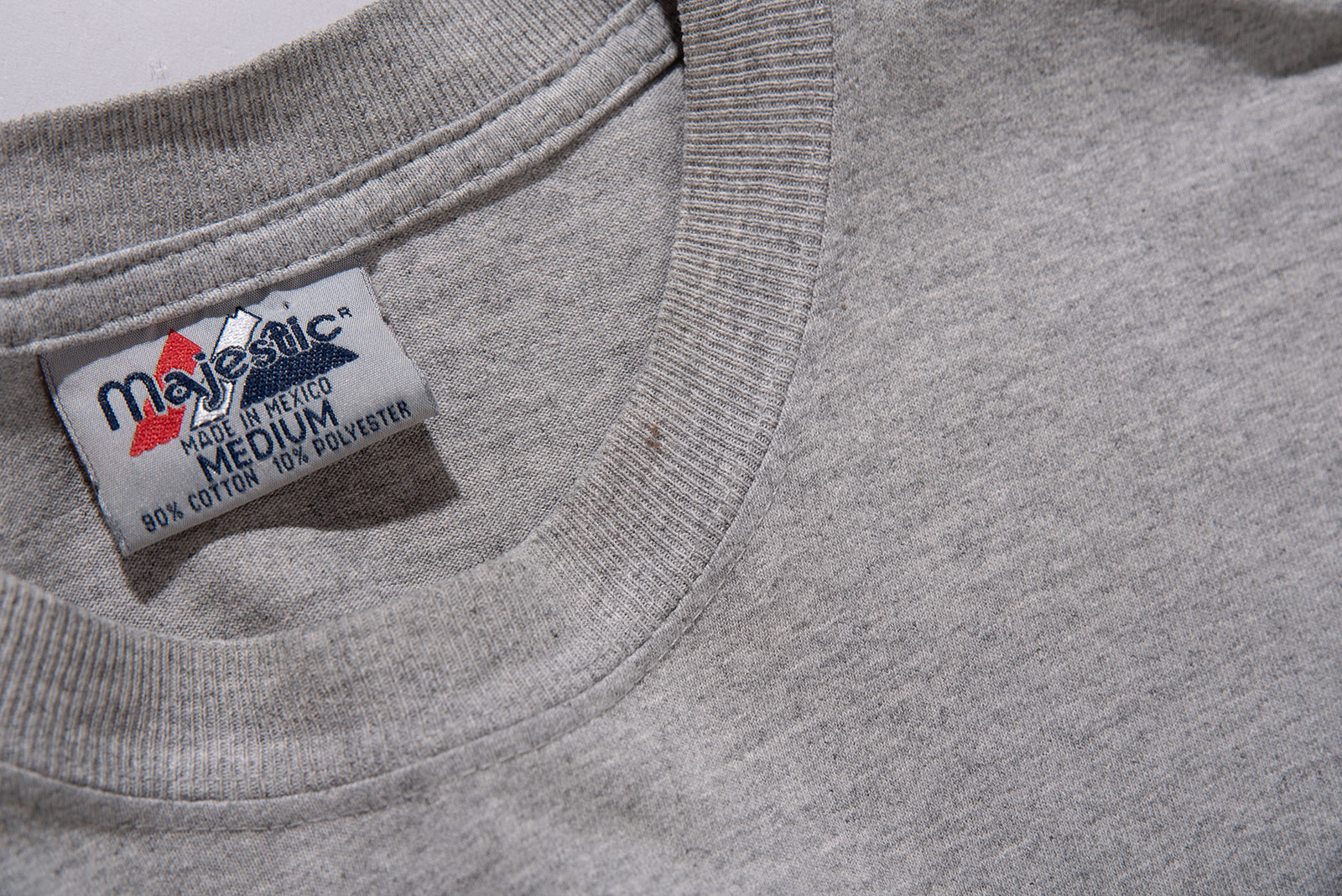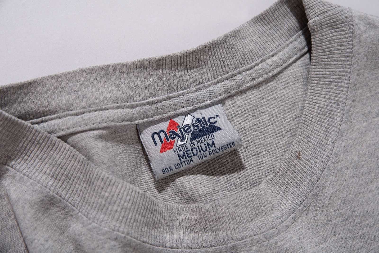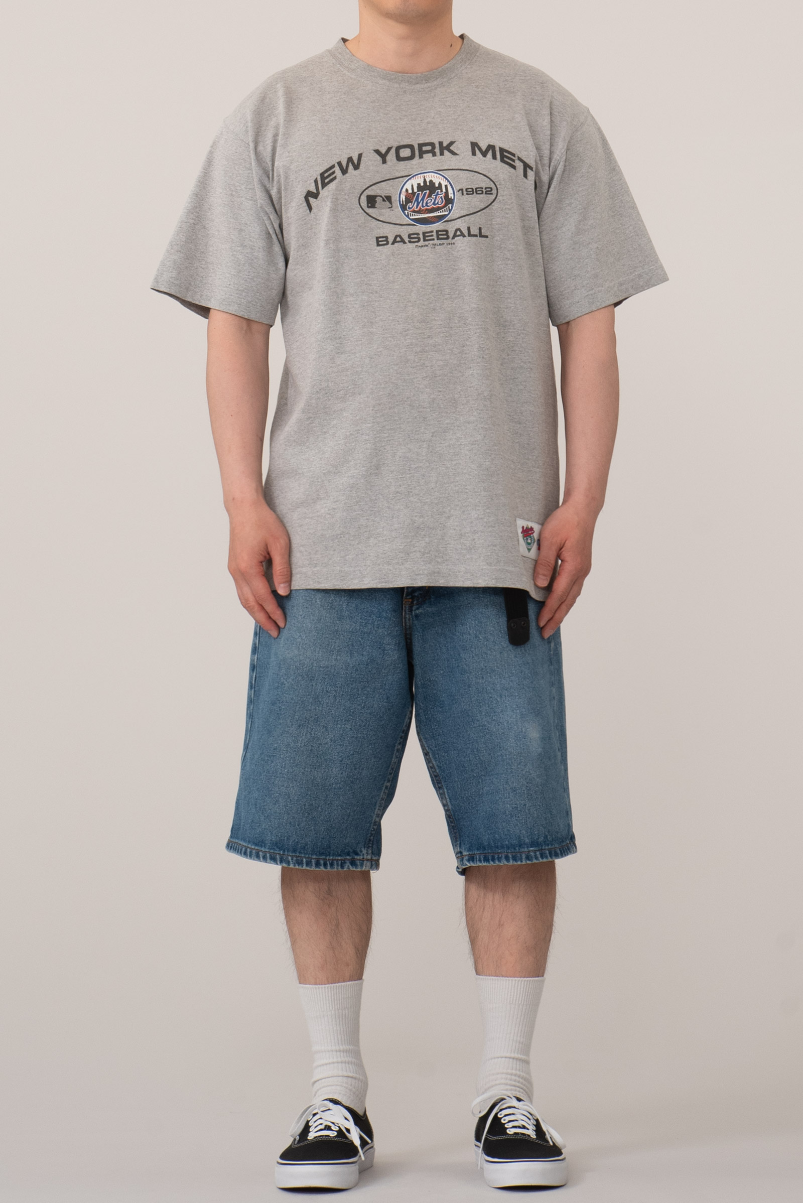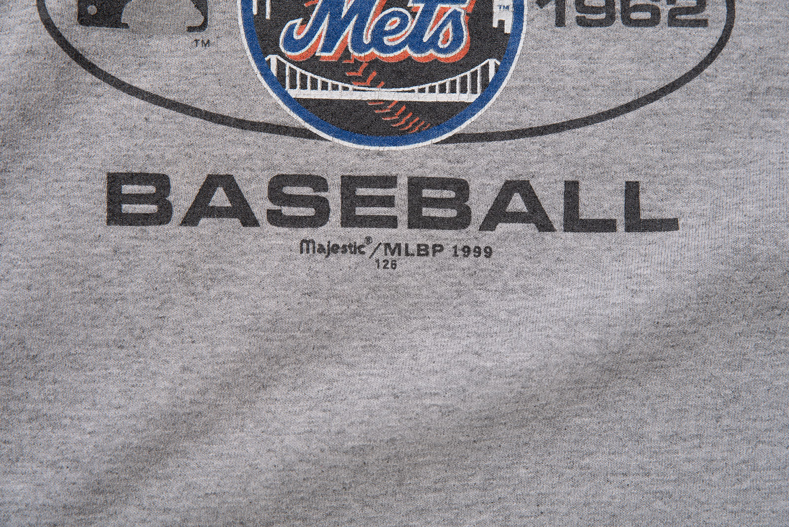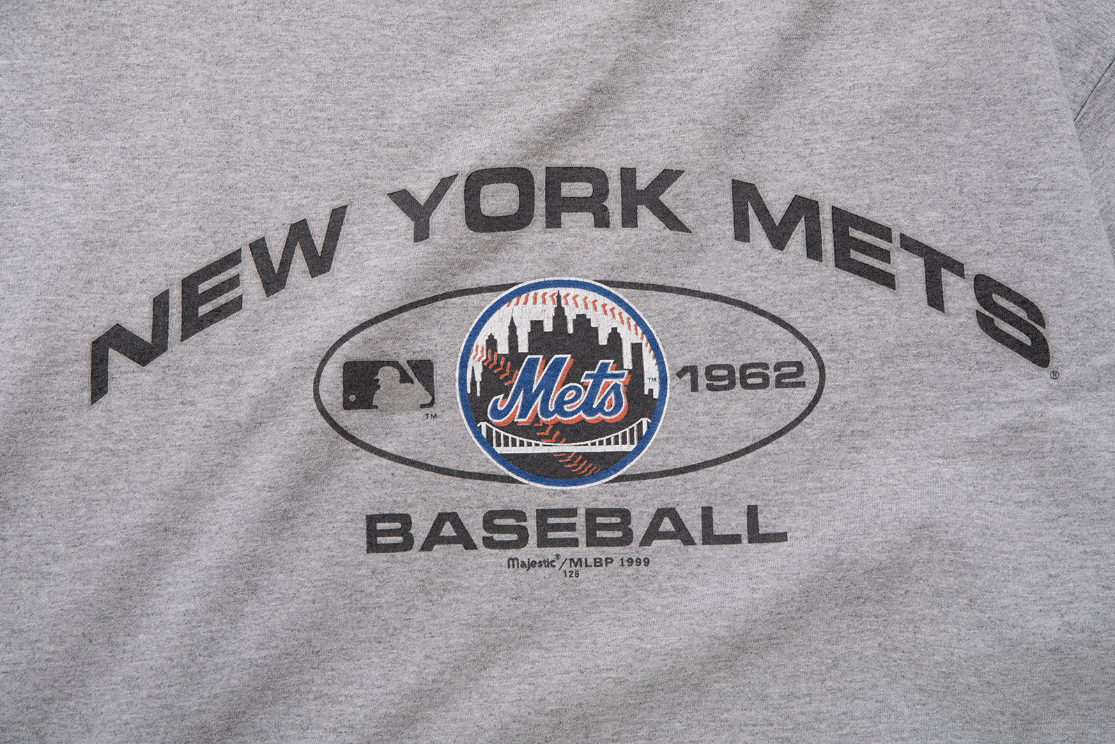 미국 메이저리그(MLB) 팀 뉴욕 메츠(New York Mets)의 로고가 전면에 인쇄된 마제스틱의 올드 제품입니다. 마제스틱은 메이저리그 공식 유니폼 공급사였던 브랜드이죠. 1999년도에 제작된 피스입니다. 면 90%, 폴리에스터 10% 혼방으로 적당한 두께의 헤더 그레이 컬러 원단이에요.