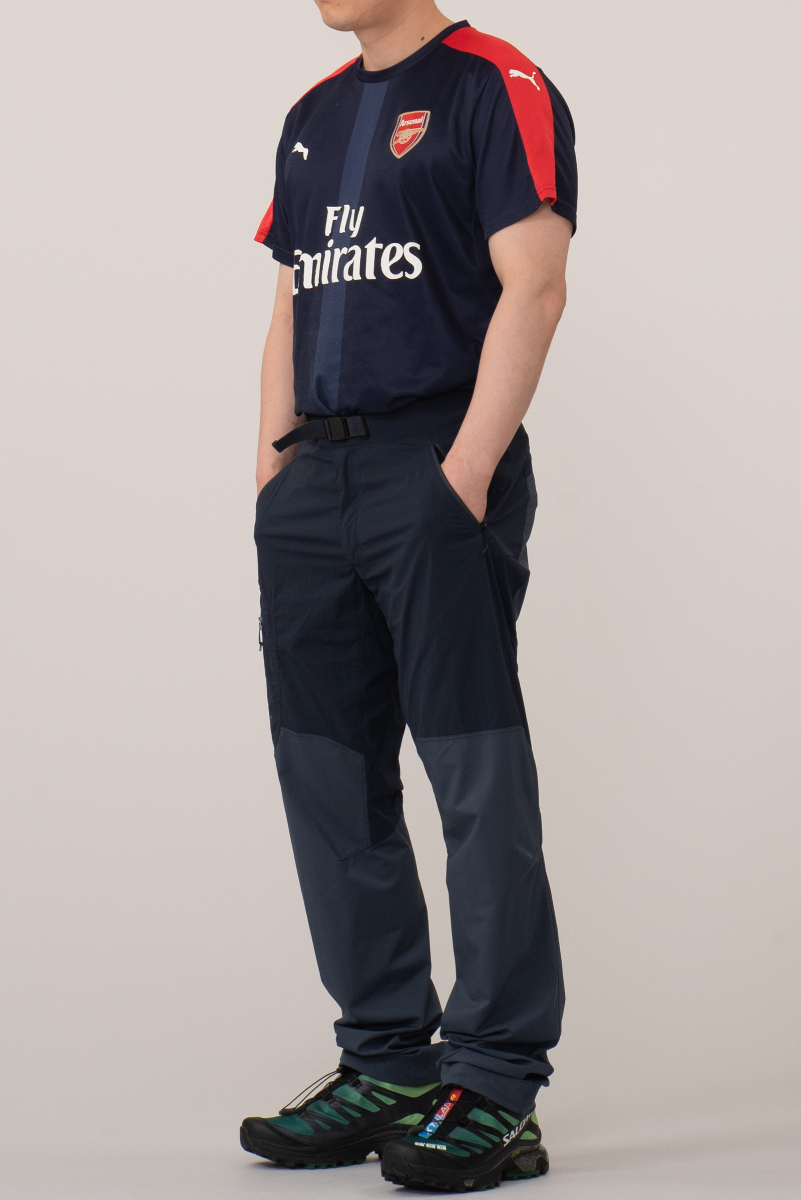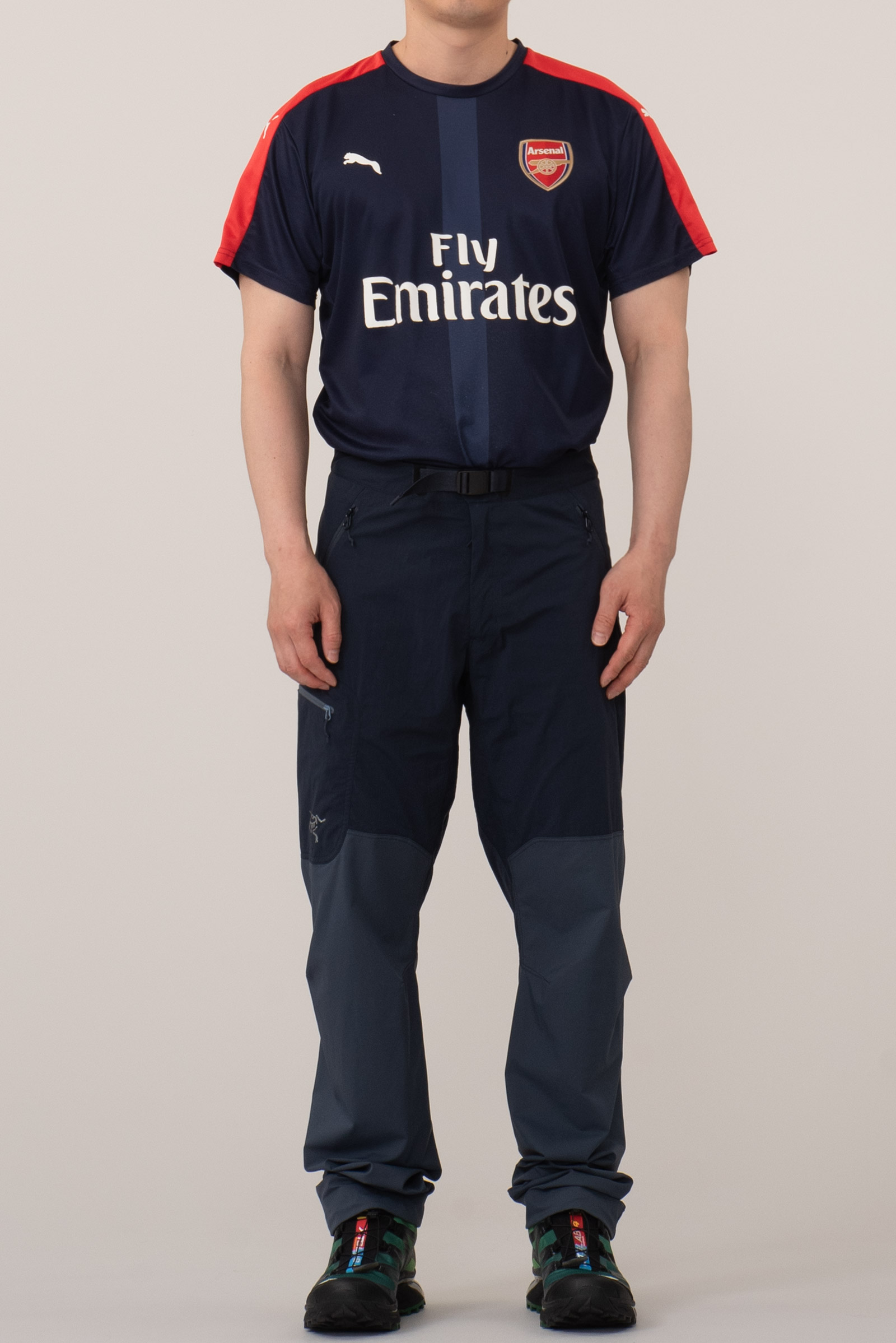 아크테릭스의 마운틴 팬츠인 감마 SL 팬츠입니다. 나일론 94%에 엘라스테인 6% 혼방으로, 전체적으로 매우 가볍고 바람과 마찰에 강한 구조입니다. 패션 센스 좋으신 분들은 테크웨어로도 활용이 가능하겠으나, 실제 등산복으로 사용이 많이 되는 제품으로 알고 있습니다. 이 바지와 맞춰 입을만한 옷이 없어 대충 코디했습니다만, 실루엣만 참고하시어 구매부탁드립니다.