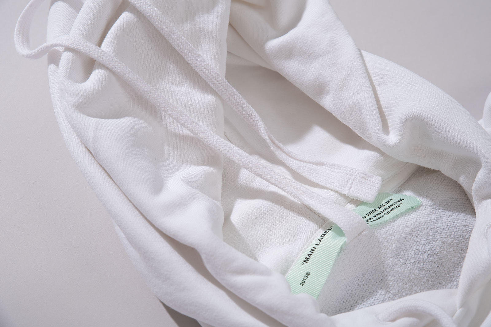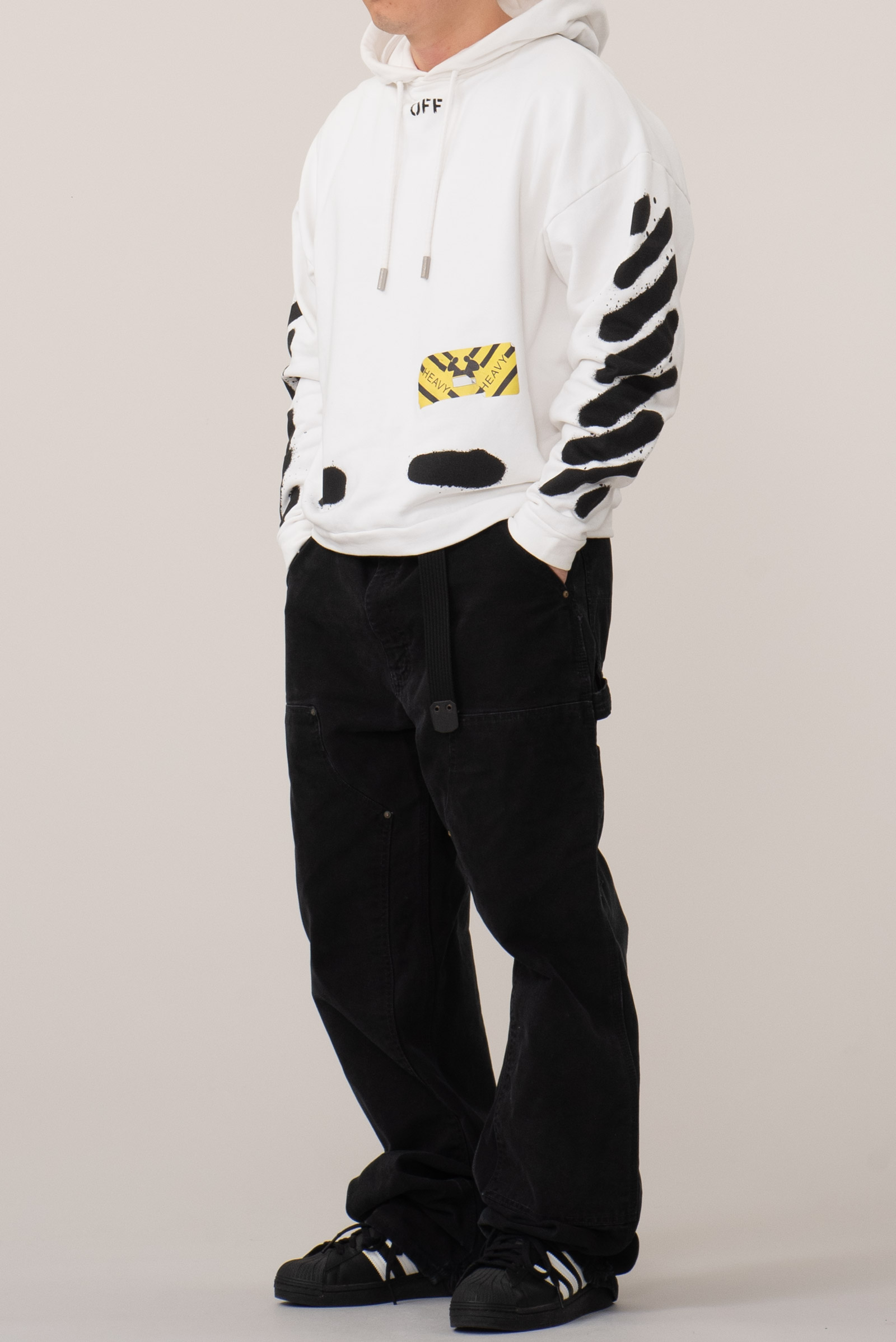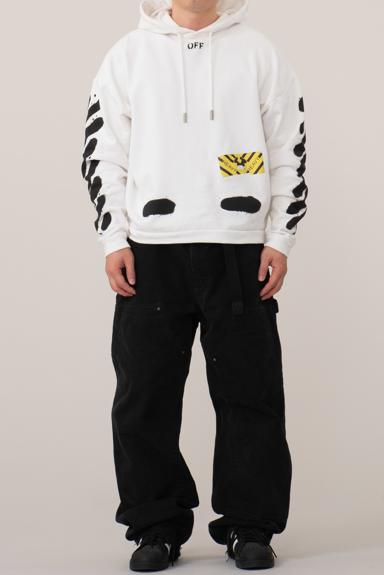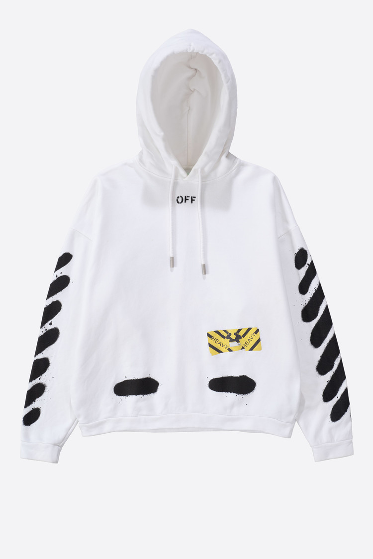 스트리트 패션 브랜드 오프 화이트의 2018년 가을/겨울 컬렉션에서 출시된 Diag Spray 후디입니다. 백 로고에 Mirror 프린트가 추가로 가미 된 동일 디자인의 후디와 두가지 스타일로 발매되었습니다. Mirror 프린트가 시즌 메인이라 소개품은 피스 수가 많지 않게 발매 되었습니다. 그래서 비교적? 희소성이 있는 디자인이에요.
