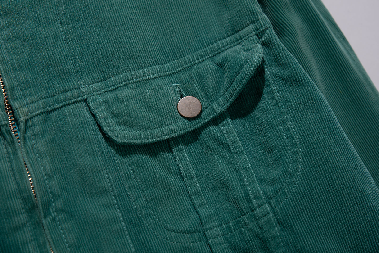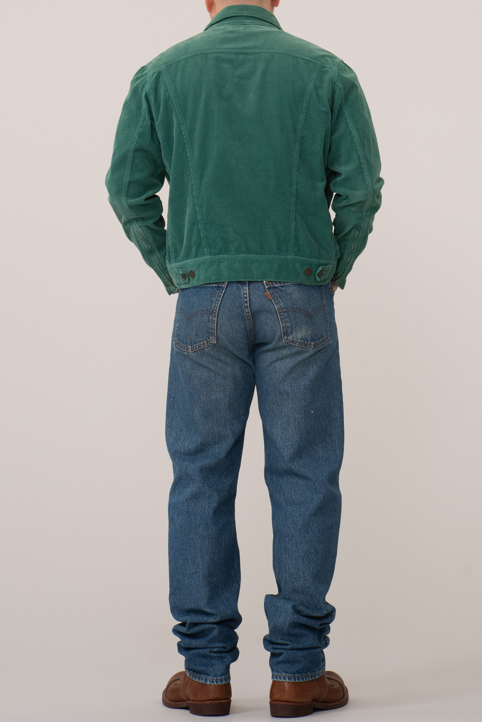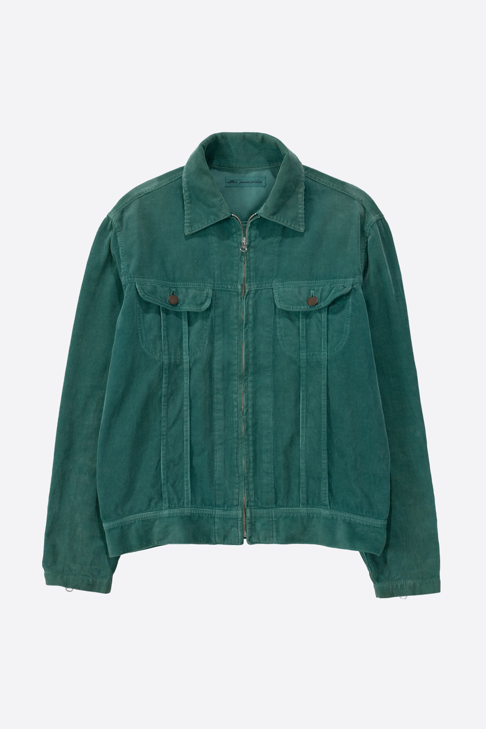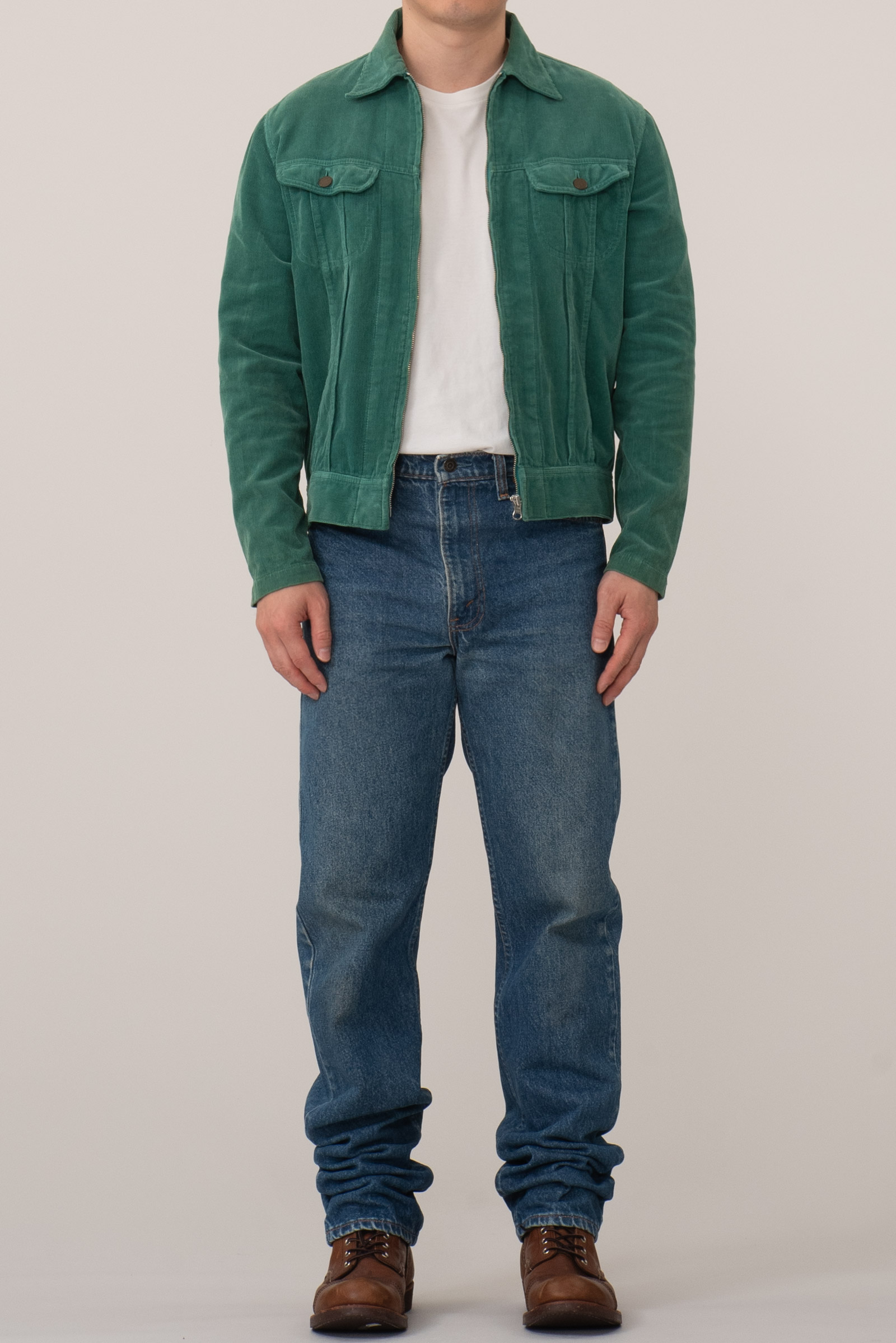2001년, 일본 도쿄에서 시작된 컨템포러리 브랜드 HARE의 코듀로이 트러커 자켓입니다. 트렌디한 도시적 감성과 세련된 미니멀리즘이 공존하는 하레 특유의 정제된 실루엣에, 1970년대를 연상케하는 자유로운 컬러감이 어우러진 것이 특징입니다. 무엇보다 Lee Riders 트러커를 연상케하는 디자인에 라이더스 재킷의 디테일이라 할 수 있는 소매 지퍼가 가미 된 것이 포인트이죠. 짧은 총장에 여유있는 팔 길이와 세련 된 핏,미니멀리즘한 디테일이 멋지게 어우러진 제품입니다. 초록색에 골덴 소재라니, 참을 수 없는 구성이기도 하고요. ㅎㅎ