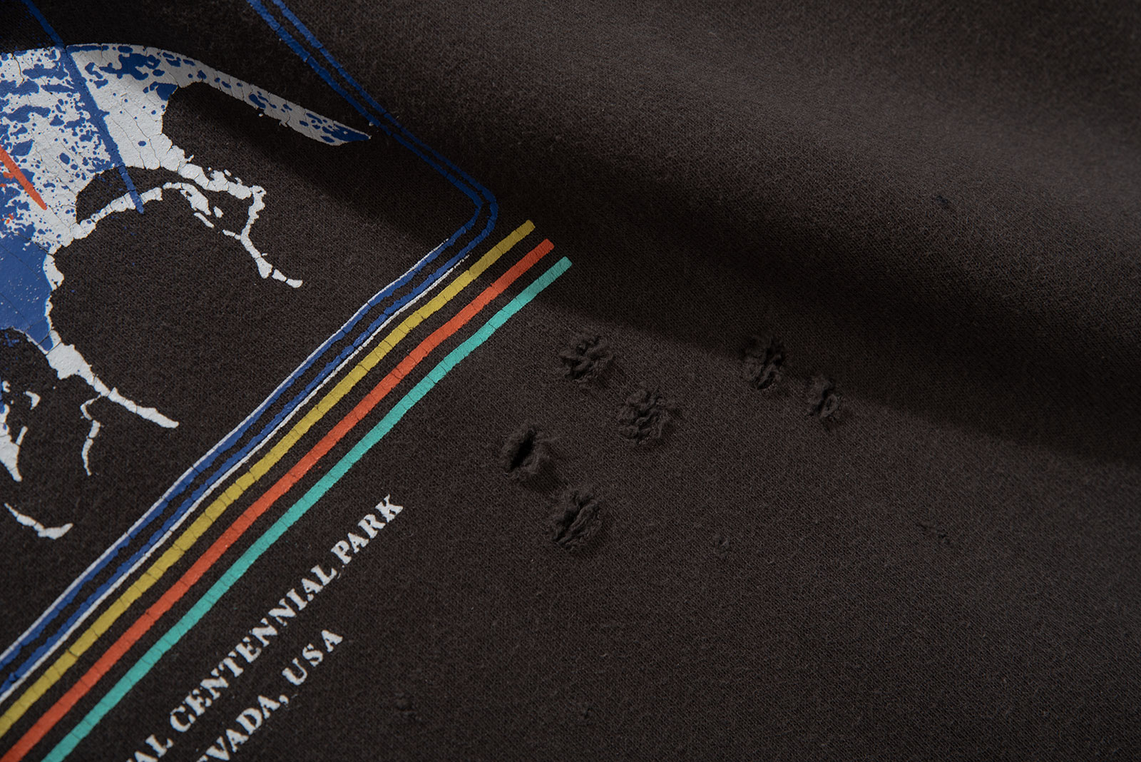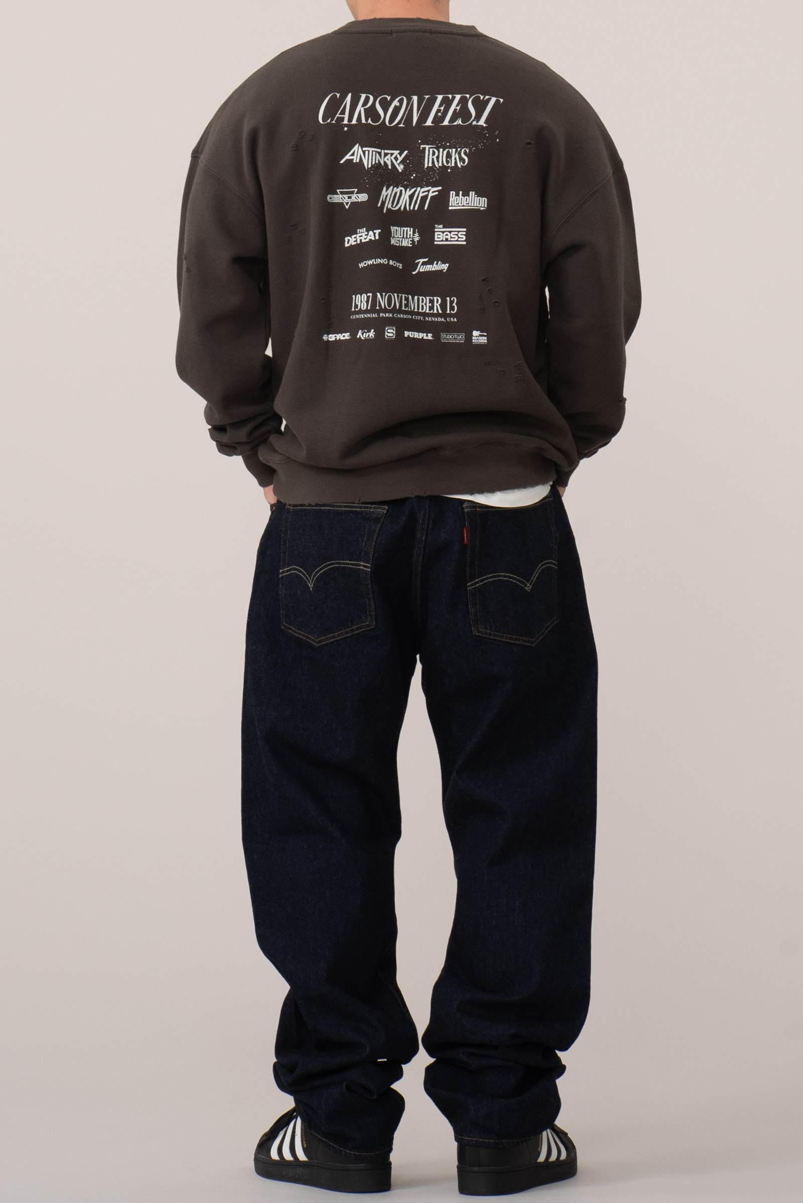 일본 도쿄 기반의 라이프스타일 브랜드 BEAMS의 CARSONFEST 그래픽 크루넥 스웻셔츠입니다. 1987년 11월 13일 미국 네바다주 카슨시티에서 열린 가상의 록 페스티벌을 테마로 빈티지 밴드 티셔츠 특유의 크랙 프린트와 헤비 디스트로이드 가공을 더해 80년대 미국 하드락·메탈 음악, 청춘과 자유의 시대 분위기를 위트있게 재해석한 아이템입니다. 요즘 한창 유행하고 있는 보로 가공이나 세인트 미카엘에서 수면 위로 올린 빈티지 가공 등이 연상되는 제품입니다.