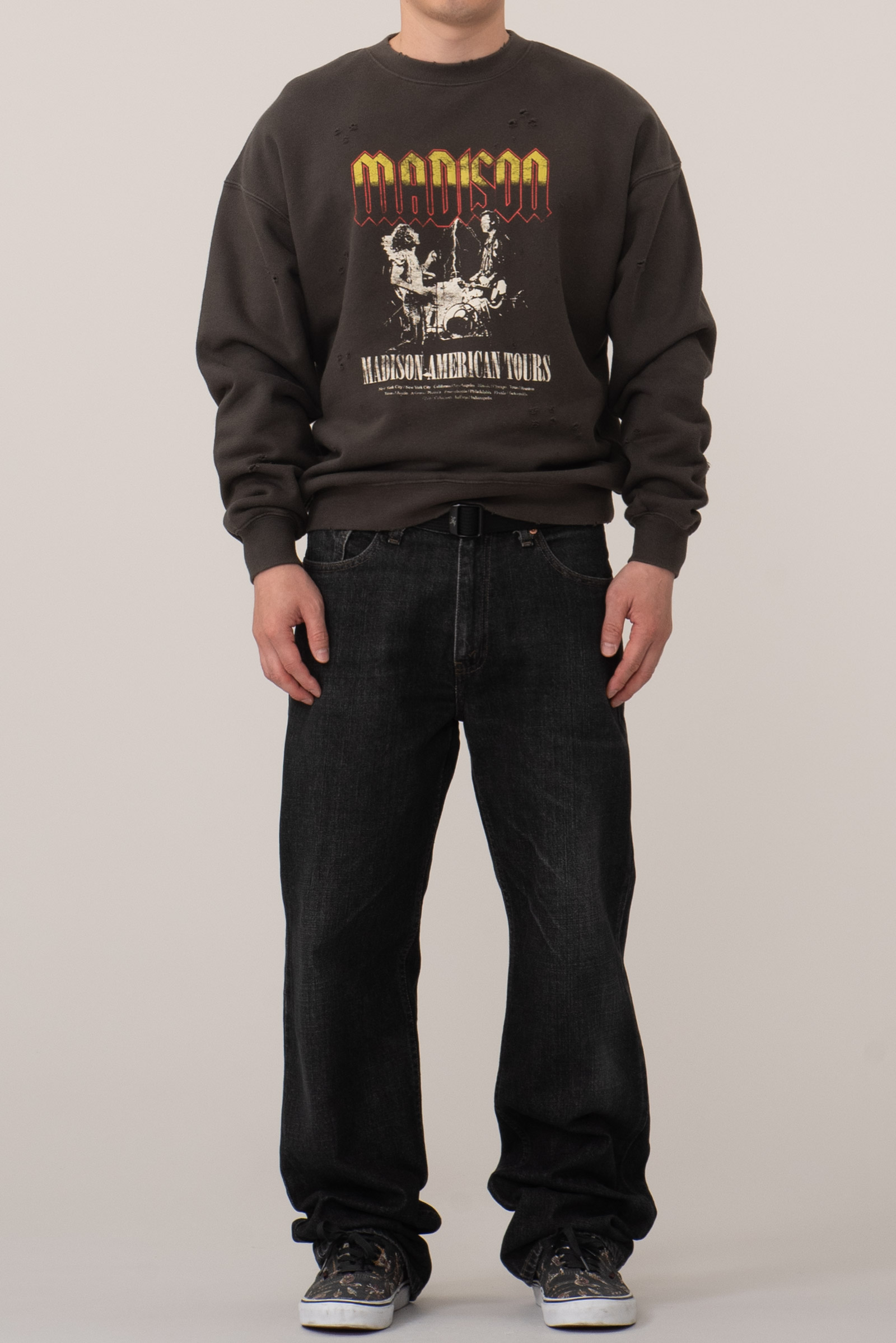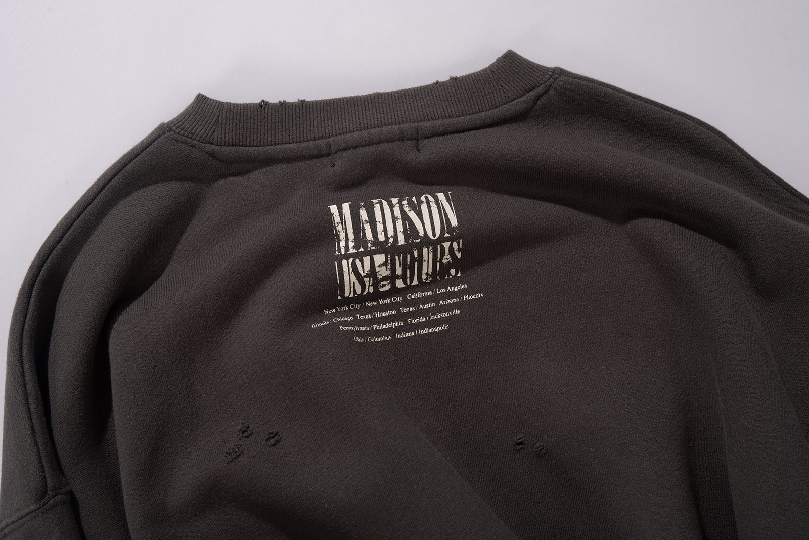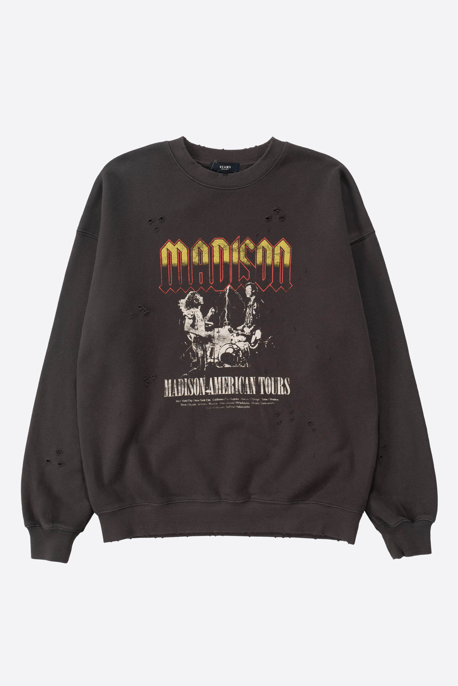 일본의 대표적인 셀렉트숍 브랜드 BEAMS의 BEAMS HEART 라인에서 출시한 크루넥 스웨트셔츠입니다. 미국 80~90년대 록밴드 투어 티셔츠에서 영감을 받아 디자인된 아이템으로, MADISON 밴드의 투어 장면과 미국 여러 도시명이 빈티지 프린트로 장식 된 제품입니다.