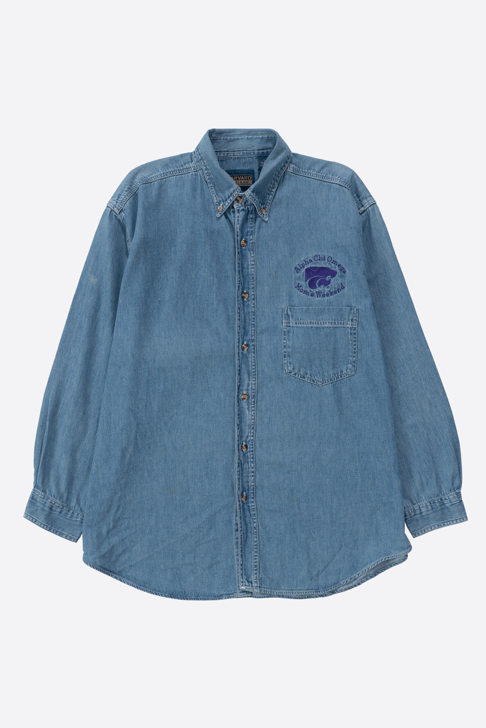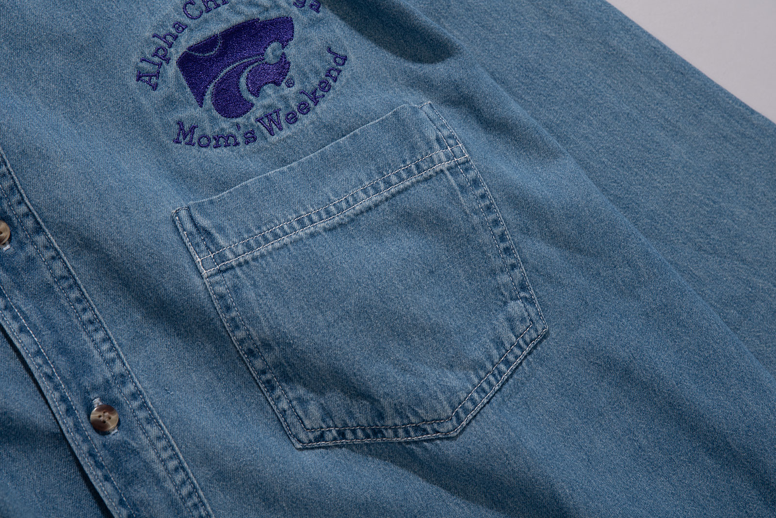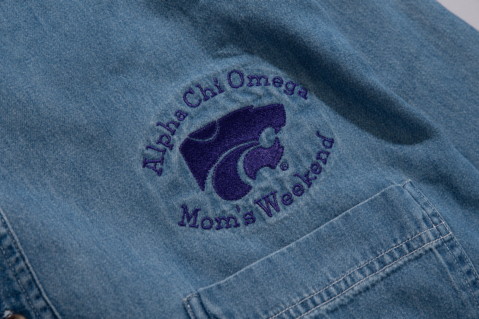 Kansas State University의 상징인 와일드캣 로고와 Alpha Chi Omega Mom’s Weekend 자수로 디자인 된 하버스 스퀘어 데님 셔츠입니다.