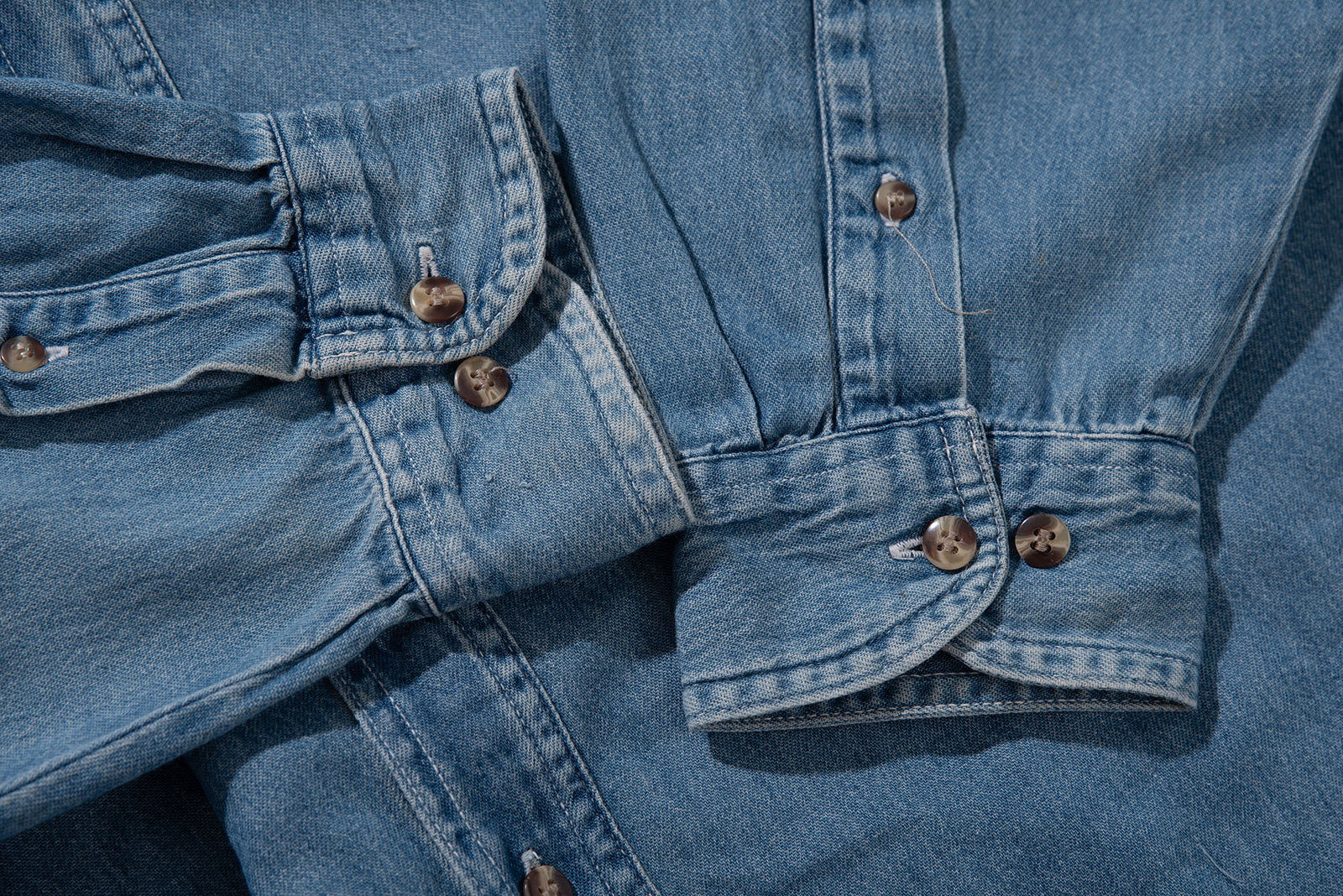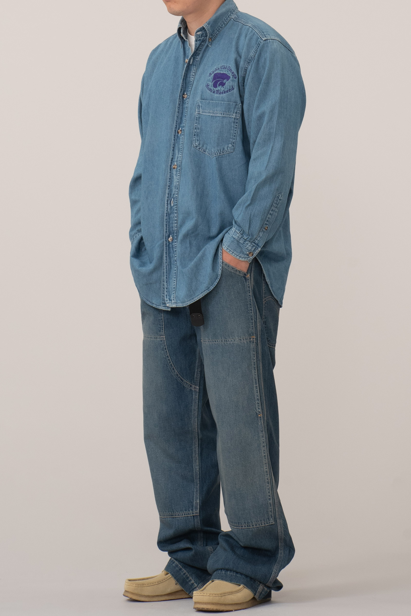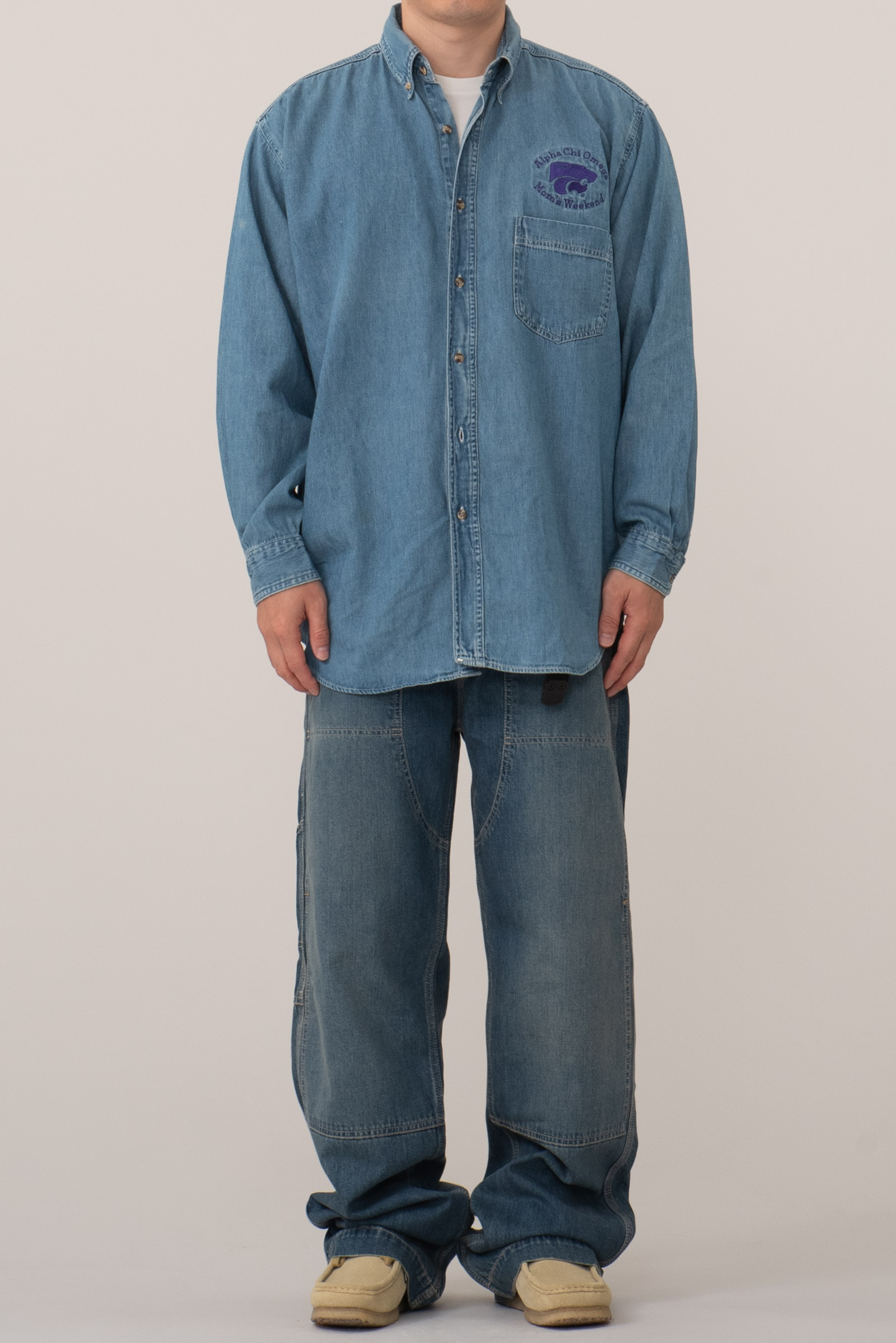 Kansas State University의 상징인 와일드캣 로고와 Alpha Chi Omega Mom’s Weekend 자수로 디자인 된 하버스 스퀘어 데님 셔츠입니다.