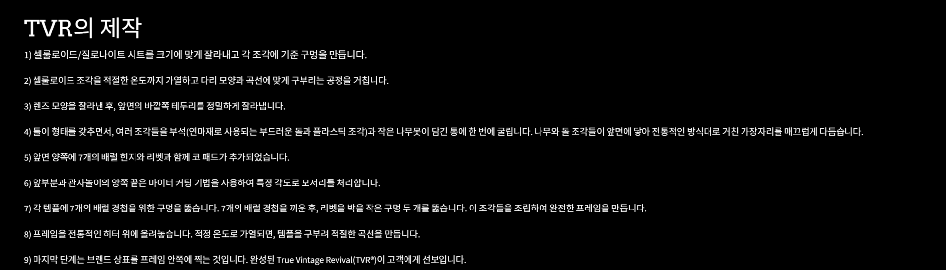 일본 수제 안경의 본고장인 일본 사바에시에서 장인들의 손에서 정성스럽게 탄생하는 TVR 504 아넬형 44 사이즈 새상품입니다. 안경 역사를 통틀어 가장 많이, 풍부하게 소비되는 클래식 빈티지 프레임들만 선별해 디자인하는 것이 TVR을 대표하는 타이틀입니다. TVR의 프레임들은 1950 년대에 널리 사용되었던 균형 측정 방식인 '데이텀 익스프레션 사이즈' 기법으로 정밀하고 섬세하게 제작되고 있습니다. 특히 빈티지 프레임들의 오리지널 템플릿과 설계도를 바탕으로 하는 것이 가장 큰 특징이라 하네요. 해당 브랜드에 관심이 있으신 분들은 오피셜 사이트를 한번 방문해보시는 것도 추천드립니다. 안경 좋아하시는 분들께는 인지도가 상당히 좋은 브랜드 중 하나입니다. 핸드메이드 프레임의 끝판왕이다, 라고 하시는 분들도 계신데, 만듦새 자체만 놓고 보면 충분히 납득이 되는 부분이에요.