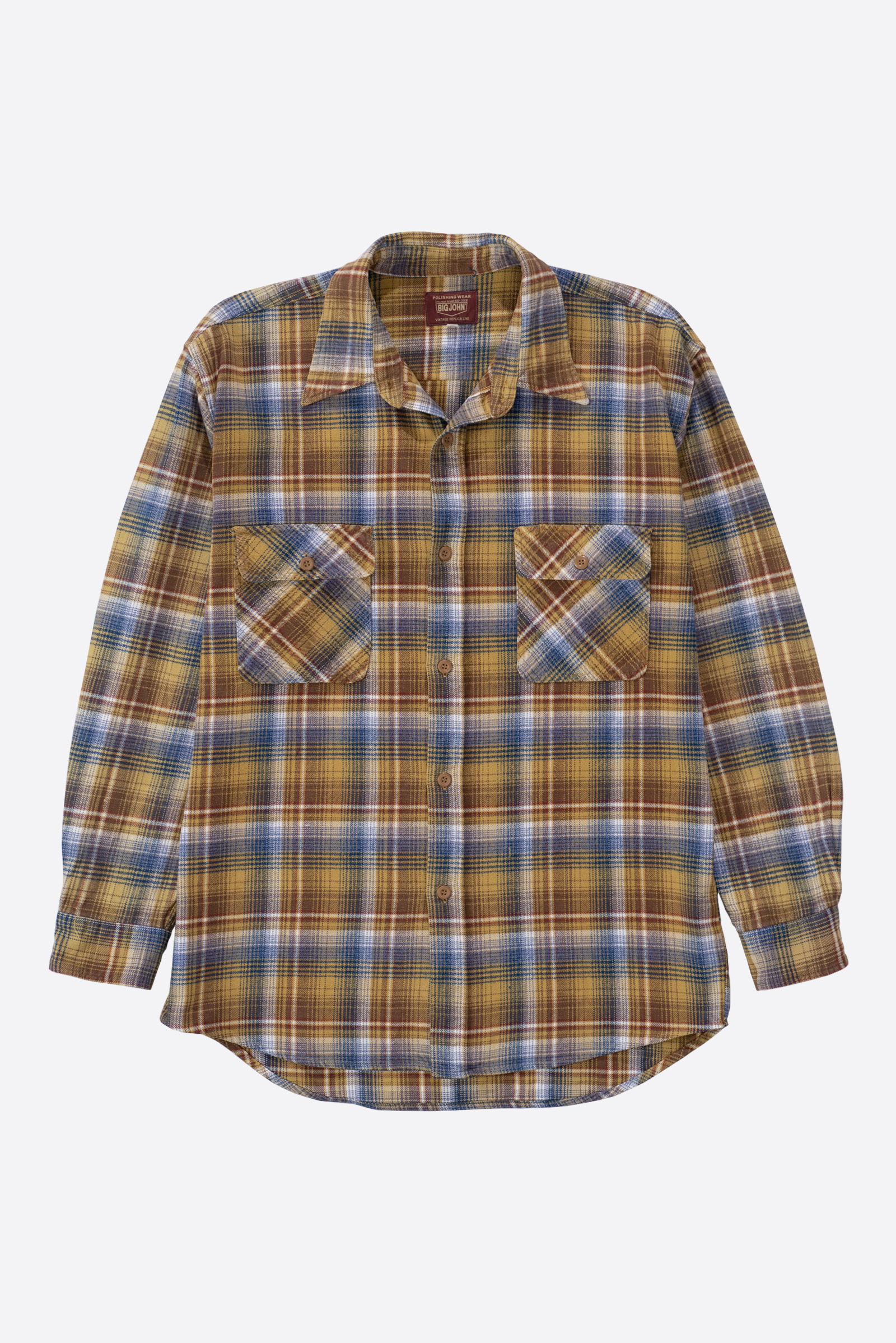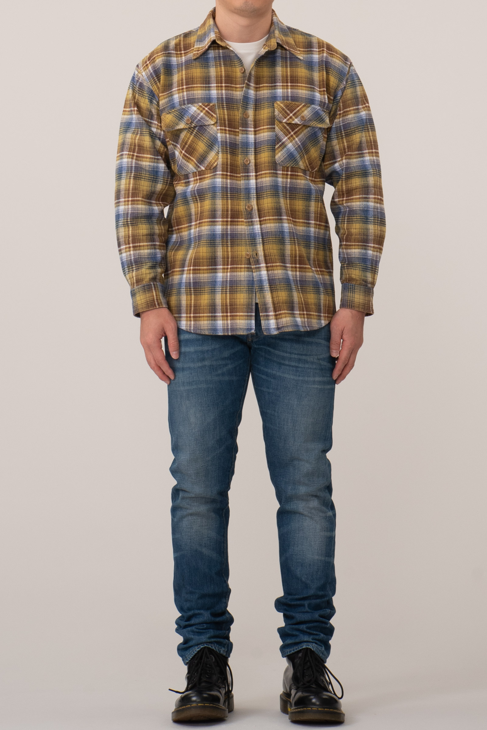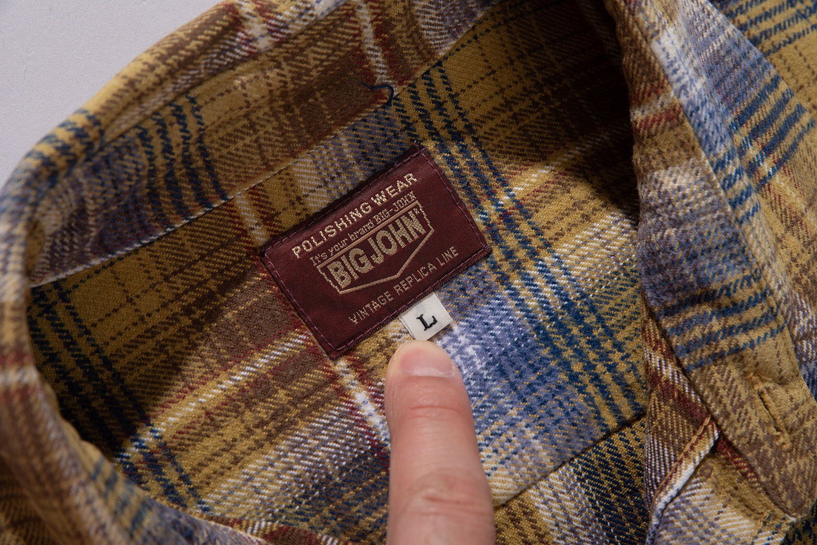 일본 오카야마에서 원단 무역업으로 시작해 일본 최초의 청바지를 제작한 데님 브랜드, 빅존의 빈티지 레플리카 시리즈의 플란넬 셔츠입니다. 70~80 년대 미국 워크웨어를 복각한 모델입니다. 올드 빅존 모델답게 만듦새도 좋고 핏도 멋스럽게 잘 나옵니다. 전반적으로 무난한 컨디션 유지하고 있습니다.