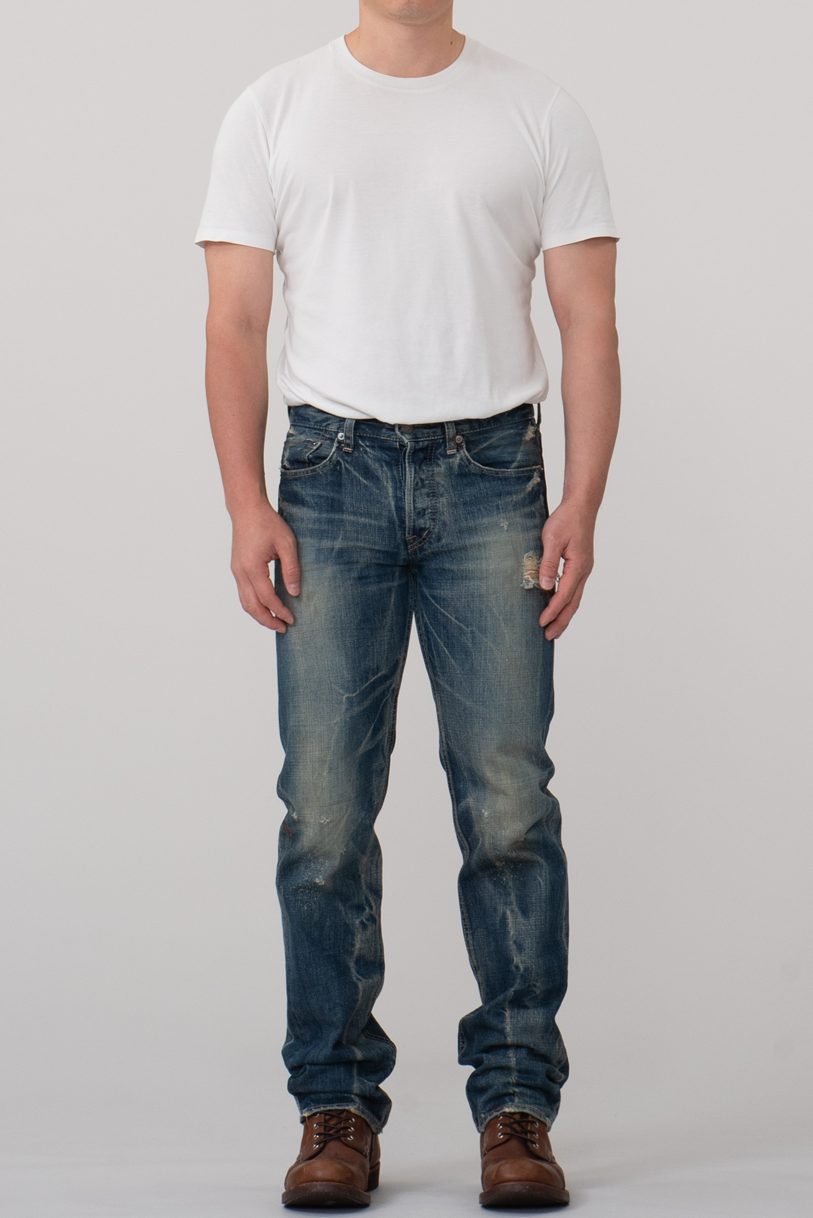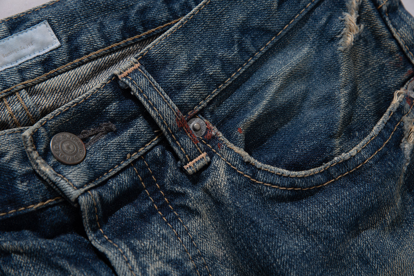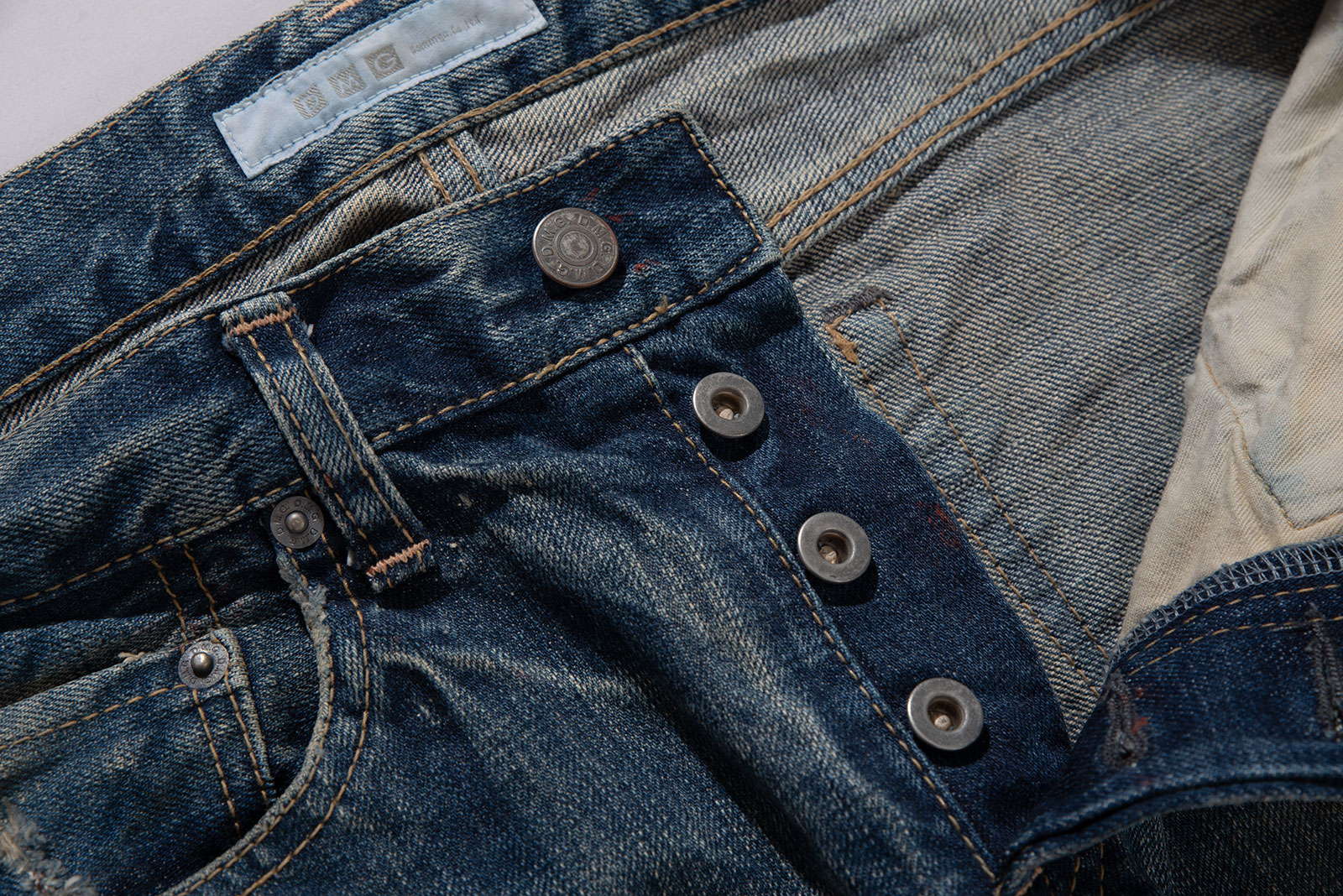 일본 오카야마 현 코지마를 기반으로 하는 일본을 대표하는 데님 회사, 도밍고 사의 캐주얼 데님 브랜드인 DMG의 데님 팬츠입니다. 현대적인 핏과 디자인, 거기에 질 좋은 데님 원단이 사용 된 가성비좋은 브랜드랄까요. 도넛형 버튼 플라이와 일제 LVC 워싱 버전을 보는 듯, 수준 높은 워싱이 일품인 제품입니다. 빨간색 페인트가 곳곳에 묻어 있습니다. 밑위가 짧아 약 28 인치 정도의 사이즈 감입니다. 실측 비교 후 구매부탁드려요.