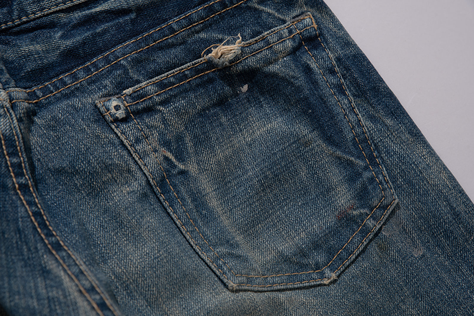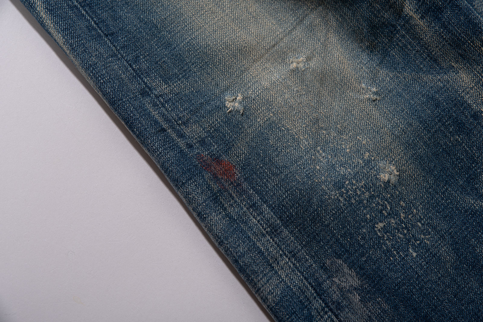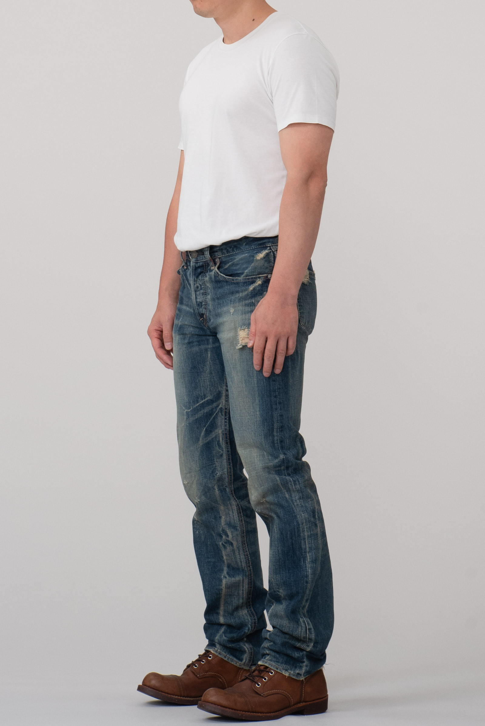 일본 오카야마 현 코지마를 기반으로 하는 일본을 대표하는 데님 회사, 도밍고 사의 캐주얼 데님 브랜드인 DMG의 데님 팬츠입니다. 현대적인 핏과 디자인, 거기에 질 좋은 데님 원단이 사용 된 가성비좋은 브랜드랄까요. 도넛형 버튼 플라이와 일제 LVC 워싱 버전을 보는 듯, 수준 높은 워싱이 일품인 제품입니다. 빨간색 페인트가 곳곳에 묻어 있습니다. 밑위가 짧아 약 28 인치 정도의 사이즈 감입니다. 실측 비교 후 구매부탁드려요.