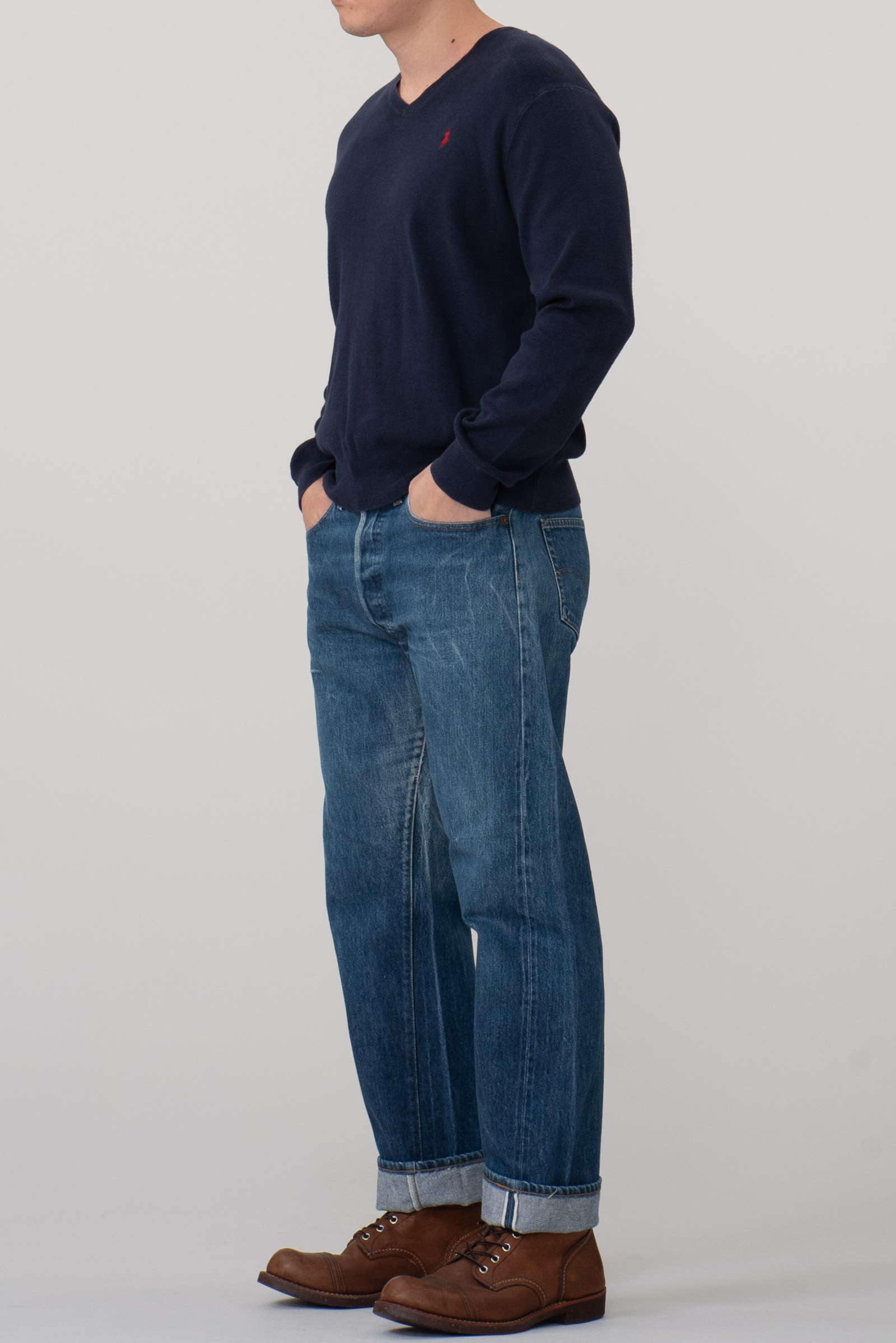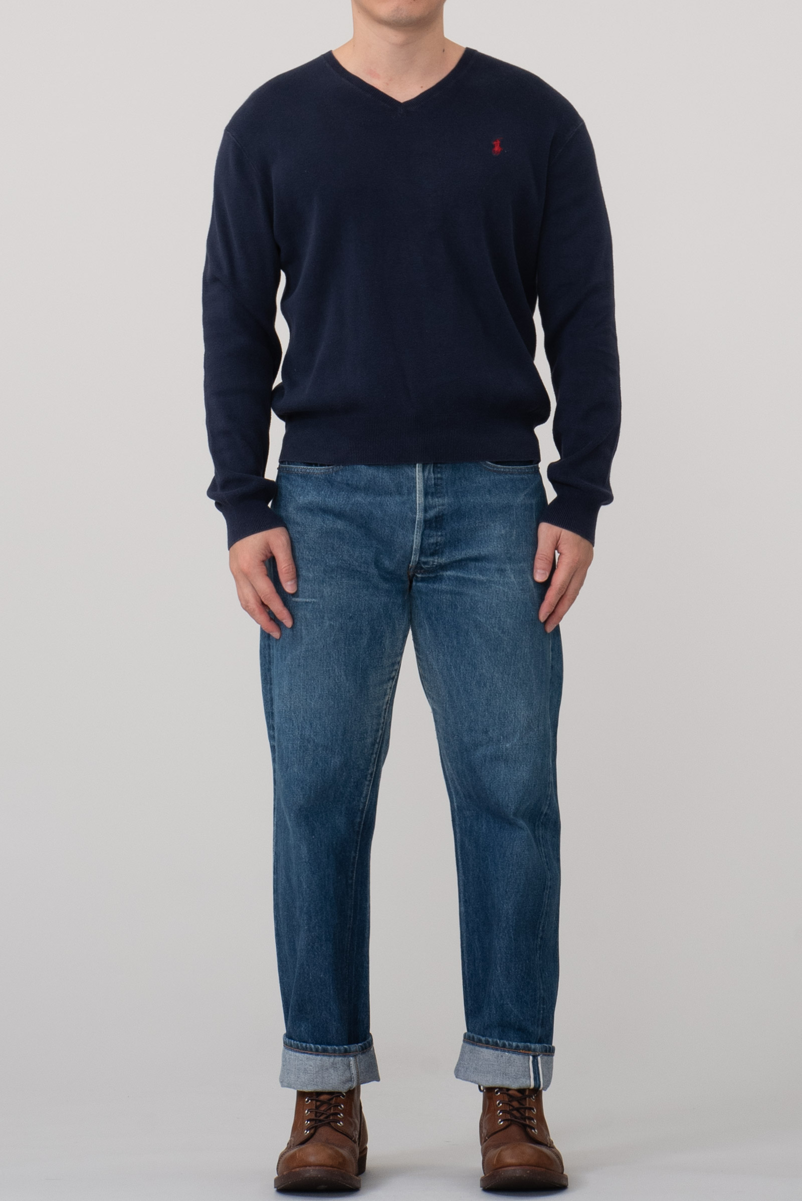 올드 폴로 랄프로렌의 코튼 v넥 니트입니다. 필링도 많이 있고 전반적으로 사용감이 많은 제품이에요. 만만하게 걸칠 옷 찾고 계신 분께 권해드립니다.